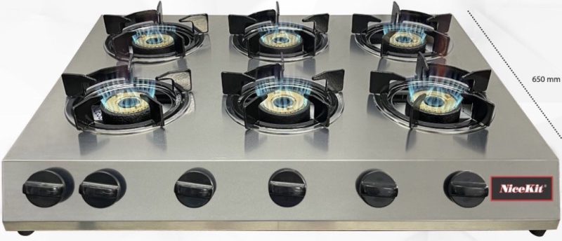 Bếp khè gas 6 lò cho hiệu năng cao, lửa lớn, mạnh, giúp việc chế biến các món Á, Âu, món xào với lửa lớn, món chiên, nước sốt… trở nên đơn giản hơn bao giờ hết. Đầu đốt được thiết kế chính xác giúp ngọn lửa xanh và tiết kiệm gas, cụm đánh lửa chắc chắn với độ bền
